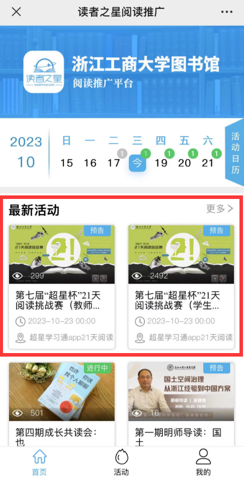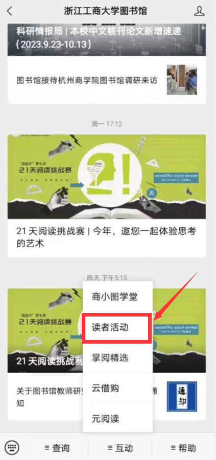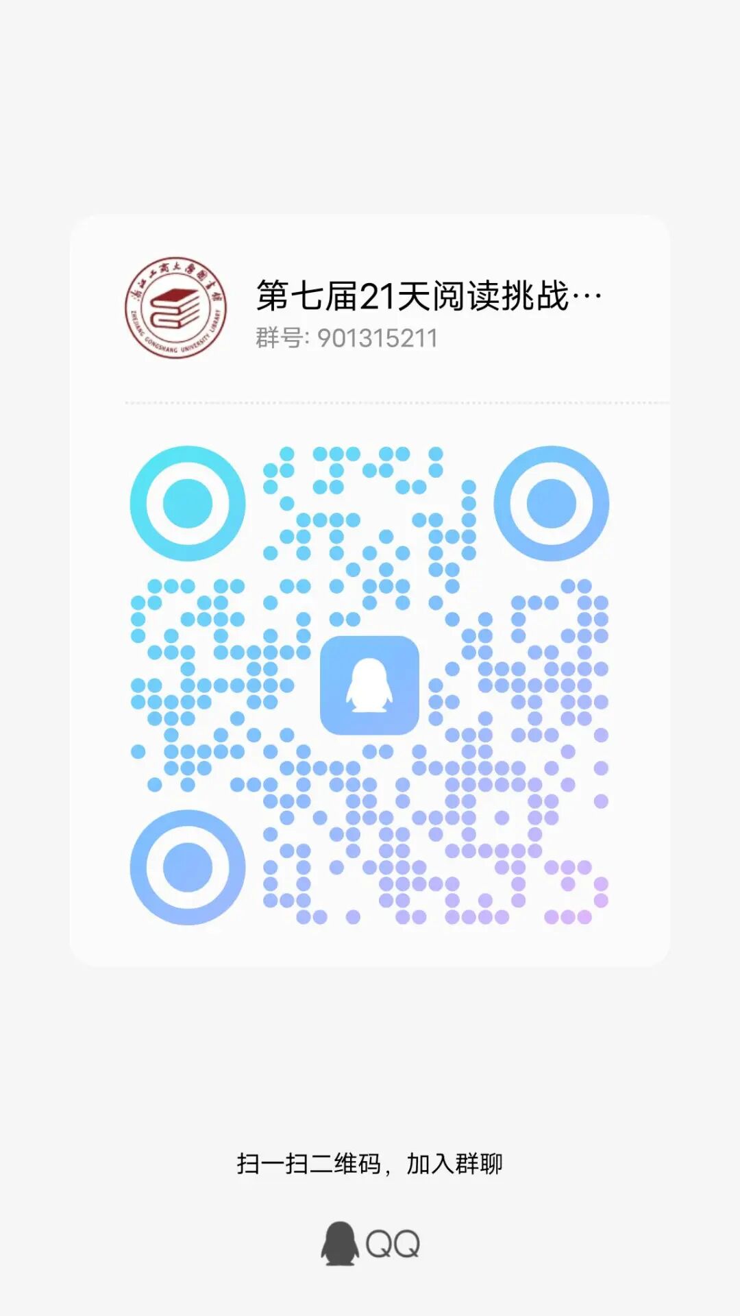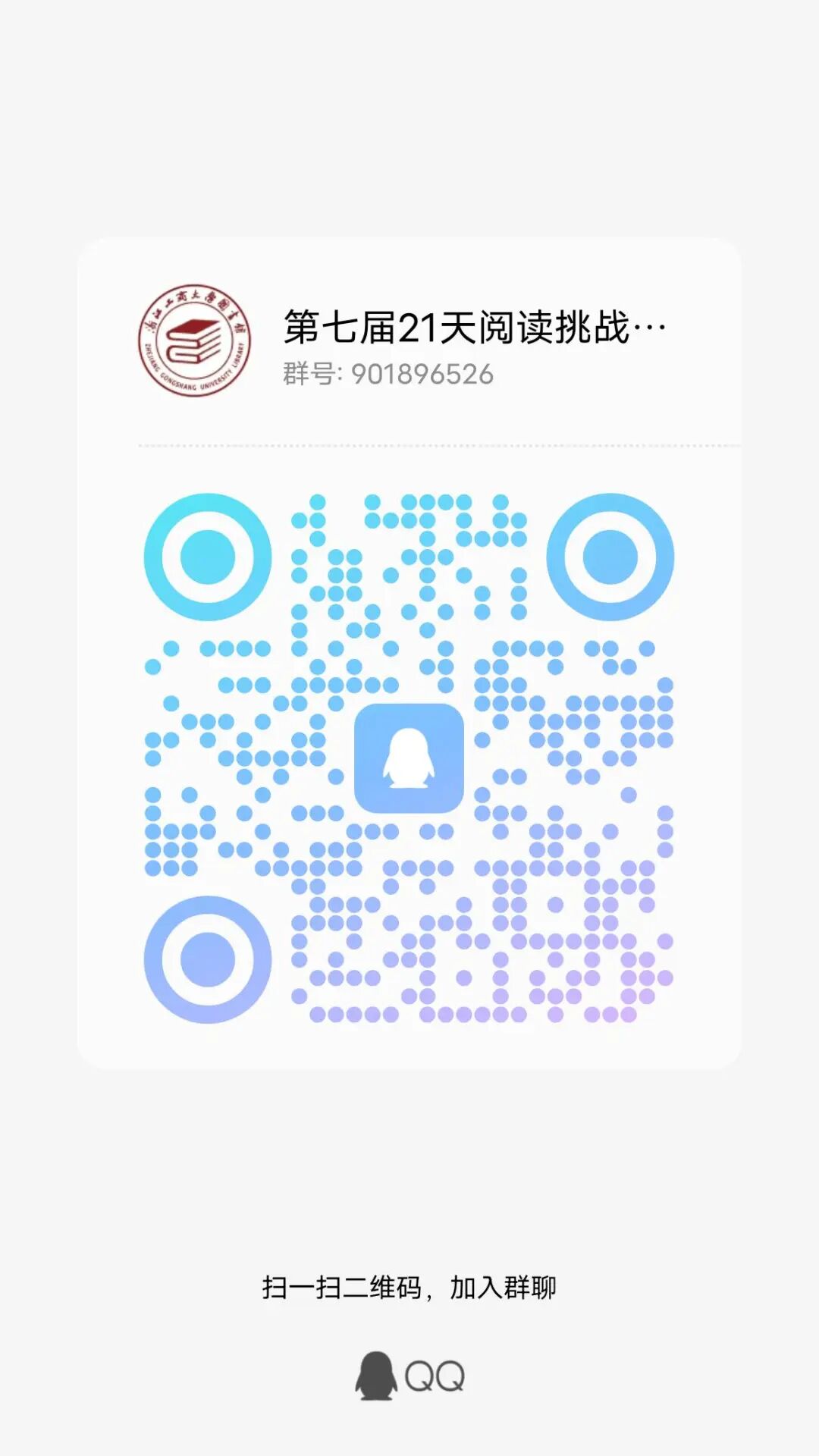 1.关注“浙江工商大学图书馆”微信公众号,点击下方菜单栏【互动】-【读者活动】-【第七届“超星杯”21天阅读挑战赛】(教工请选择教师组,学生请选择学生组),也可扫描下方二维码直接进入页面。