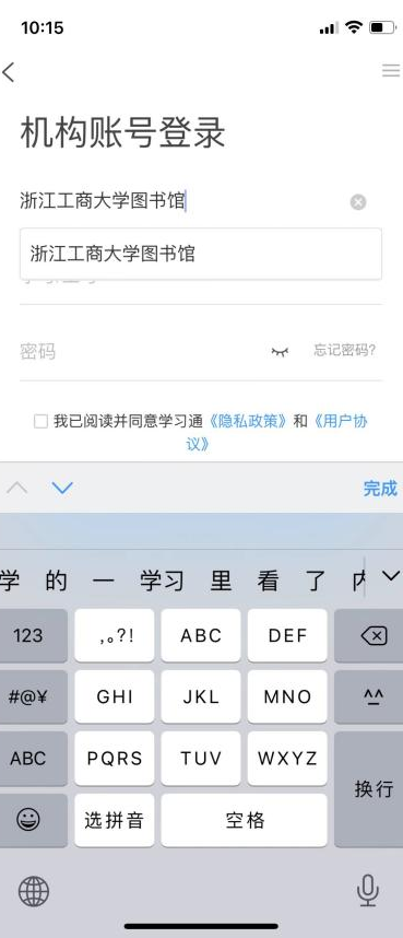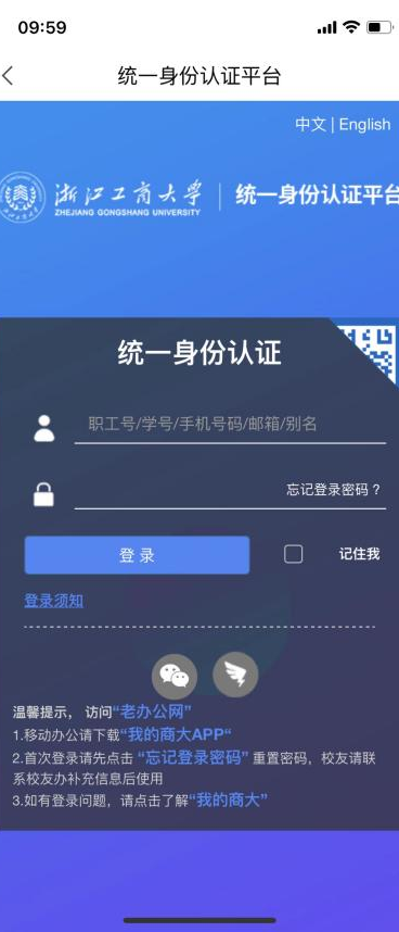 (1)在单位名称栏输入并选择“浙江工商大学图书馆”,进入统一身份认证平台界面,输入统一身份认证账号和密码并登录。