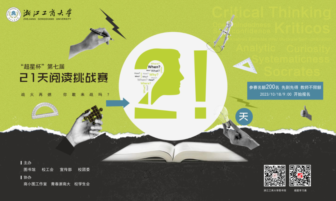 为深入贯彻党的二十大关于深化全民阅读活动、建设书香社会精神,落实教育部等八部门关于印发《全国青少年学生读书行动实施案》的文件精神,紧扣学校“聚焦内涵发展,加快建设卓越大学”的中心工作,探索创新人才培养新路,提升学生的批判性思维,图书馆联合校工会、宣传部、团委举办“超星杯”第七届21天阅读挑战赛。