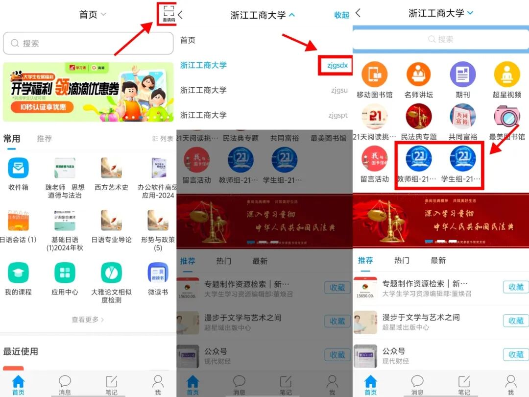 将“首页”改为“浙江工商大学zjgsdx”,进入页面后直接点击“学生组-21天阅读挑战赛”或“教师组-21天阅读挑战赛”图标(或在学习通首页点击右上角“邀请码”,输入短信中的活动邀请码),申请加入阅读小组时请备注报名的姓名和手机号,等待管理员审核通过后即可成功加入小组。