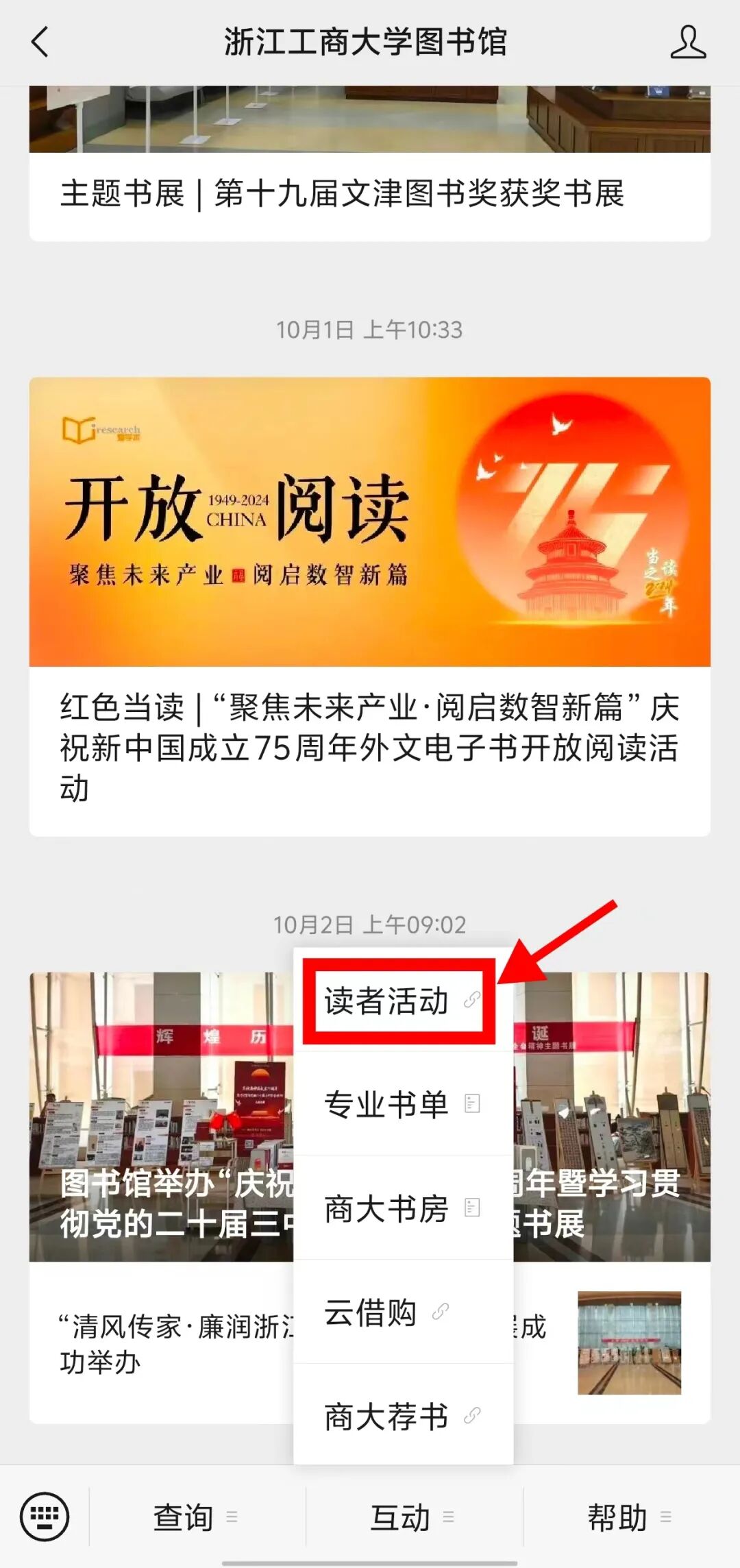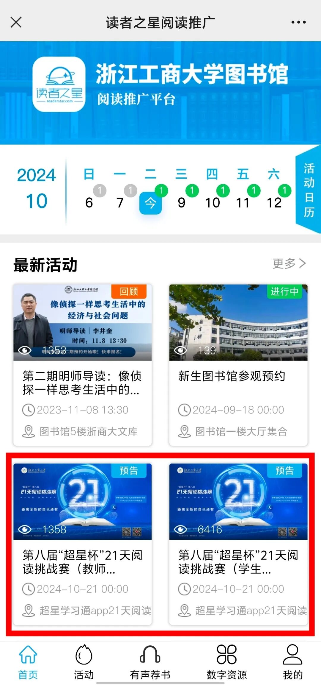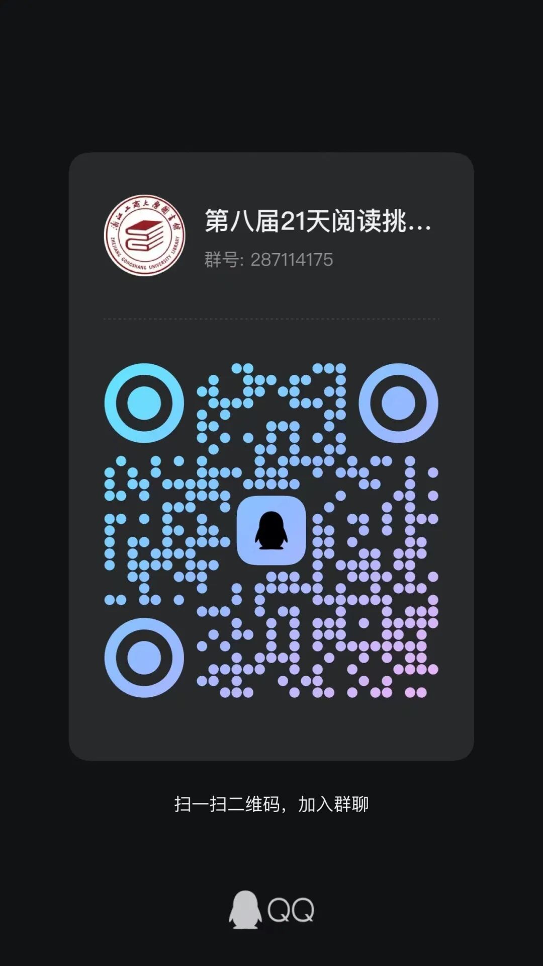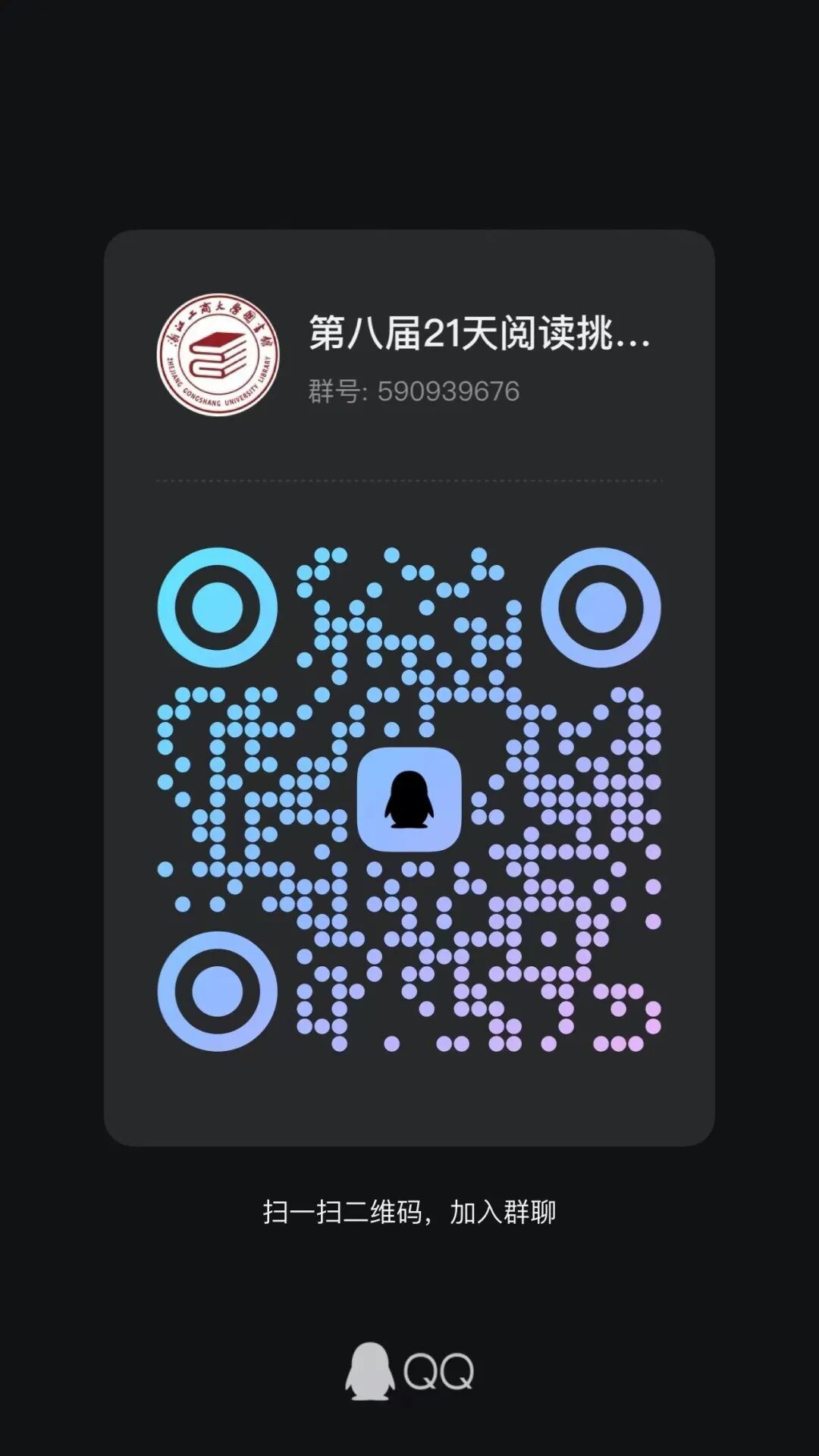 1.关注“浙江工商大学图书馆”微信公众号,点击下方菜单栏【互动】-【读者活动】-【第八届“超星杯”21天阅读挑战赛】(教工请选择教师组,学生请选择学生组),也可扫描下方二维码直接进入页面。
