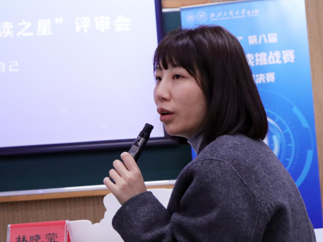 作为嘉宾图书馆副馆长赵丹表示,与去年相比,本届比赛在空间拓展方面得到了更大提升,桐庐校区杭州商学院的老师专程前来参加。她期望 21 天阅读挑战赛能为终身学习机制树立示范模板,未来有更多老师参与其中,也希望有更多学校领导及相关领域专业老师加入评审团队,使阅读的火种在商大广泛传播。