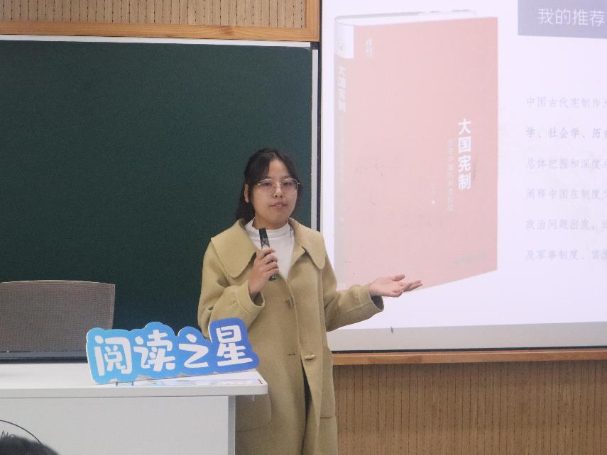 来自公共管理学院的窦梦雪同学,借“阅读究竟有什么意义呢?”发问,分享了自己总结的阅读方法,分别是框架构建法、思辨阅读法以及实践应用法。她以书籍《大国宪制:历史中国的制度构成》为例,介绍了自己阅读时从理解书籍结构、深入思考到将知识应用于实践的递进过程,也是把书变薄、把书变厚、把书“变没”的过程。最后她提到,阅读不仅要成为一种习惯,更要成为一种实践。