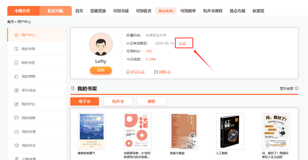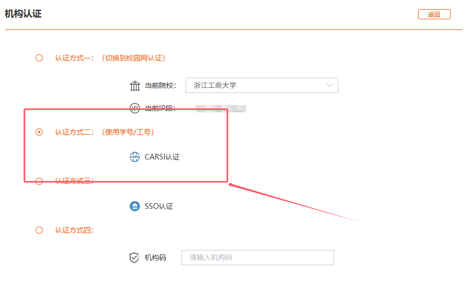 机构认证:1、在校园网IP范围内注册/登录的用户,系统自动认证。用户IP认证后,每次享有最长90天的离校访问权限,到期后需再次认证。