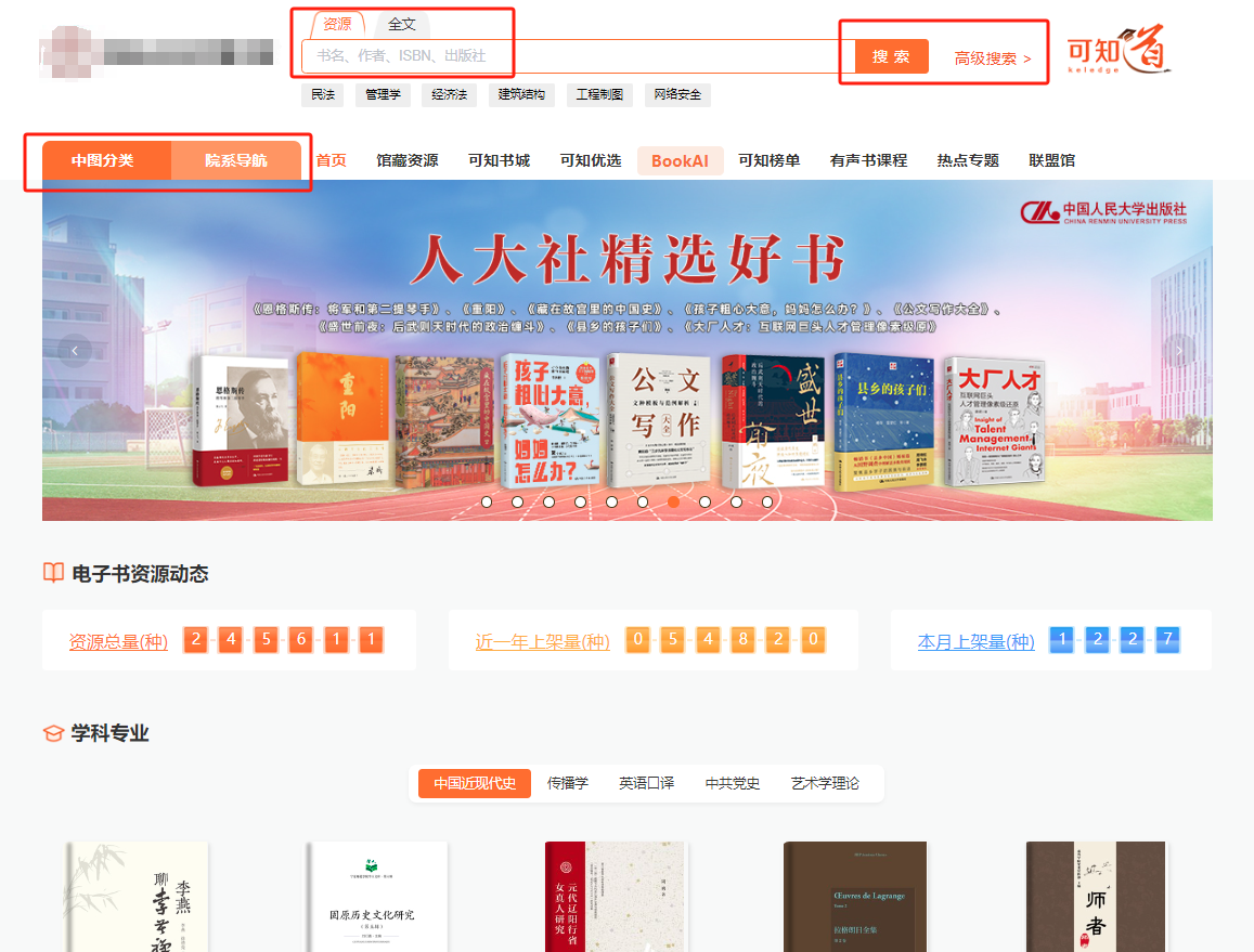 资源查找:可根据院系专业分类或通过关键字、出版社、作者、ISBN进行资源检索和查找。