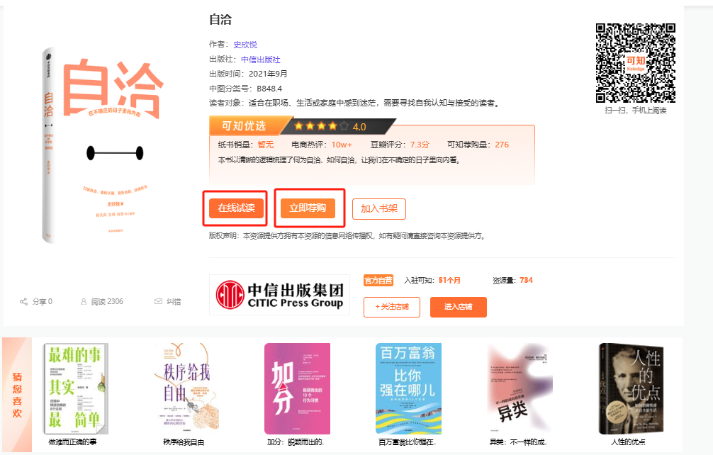 电子书试读和荐购:在查到所需资源后,可点击图书封面进入图书详情进行试读和荐购。