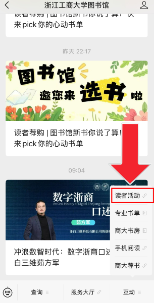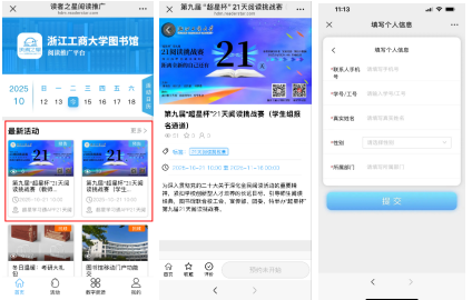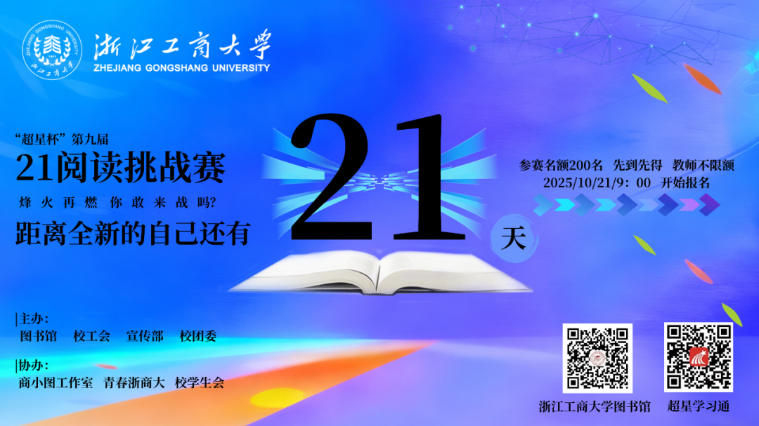 关注“浙江工商大学图书馆”微信公众号,点击下方菜单栏【互动】-【读者活动】-【第九届“超星杯”21天阅读挑战赛】(教工请选择教师组,学生请选择学生组),也可扫描下方二维码直接进入页面。