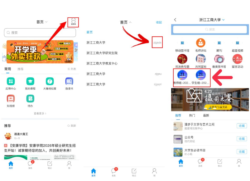 将“首页”改为“浙江工商大学zjgsdx”,进入页面后直接点击“学生组-21天阅读挑战赛”或“教师组-21天阅读挑战赛”图标(或在学习通首页点击右上角“邀请码”,输入短信中的活动邀请码),申请加入阅读小组时请备注报名的姓名和手机号,等待管理员审核通过后即可成功加入小组。