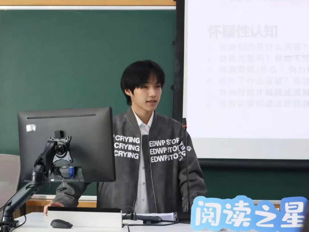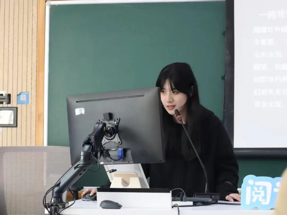 来自马克思主义学院的陈婉玓同学以“如何在群体时代努力去做一个清醒的自己”发问,分享了自己的阅读方法与感悟:阅读时带着批判三问——问背景是什么、问阐述了什么观点、问与实际有什么关系,通过批判三问能让她不再是信息的被动接受者,而是一个能与伟大作者对话的思考者;她以《乌合之众》这本书告诉我们——我们始终要以历史的、辩证的眼光去看待世界,同时也要坚信科学的理论可以武装头脑,可以唤醒个体和群体的自觉性。