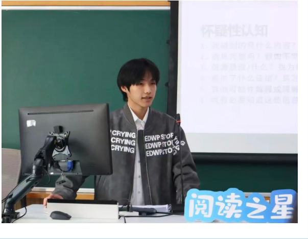 来自法学学院的陈宣宇同学以“社科著作的阅读之道”为主题,为大家讲述了自己对阅读的思考和感悟。他不仅分享了阅读方法:梳理逻辑、巧用图表;梳理概念、联系生活;发散思维、综合理解,而且他还讲到在遇到非专业的知识或者难以理解的知识时我们要巧用AI,帮助我们更好地理解。